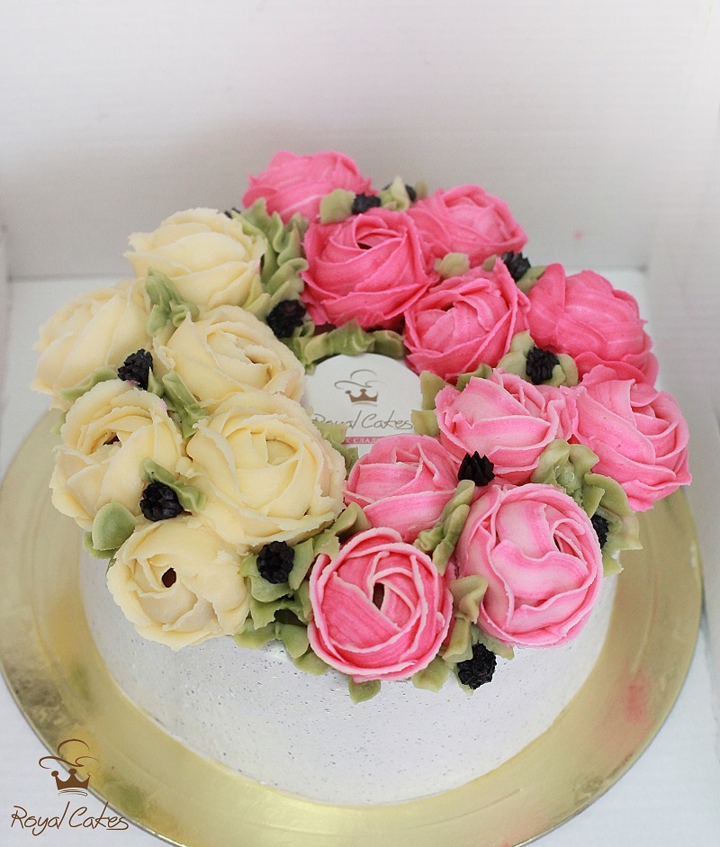 На данный момент моё любимое оформление торта и так сказать эксклюзивная работа — это масляные цветы. Ровный или голый торт, украшен полумесяцем цветами из крема. Так же в моде остается акварельные и амбре торты.