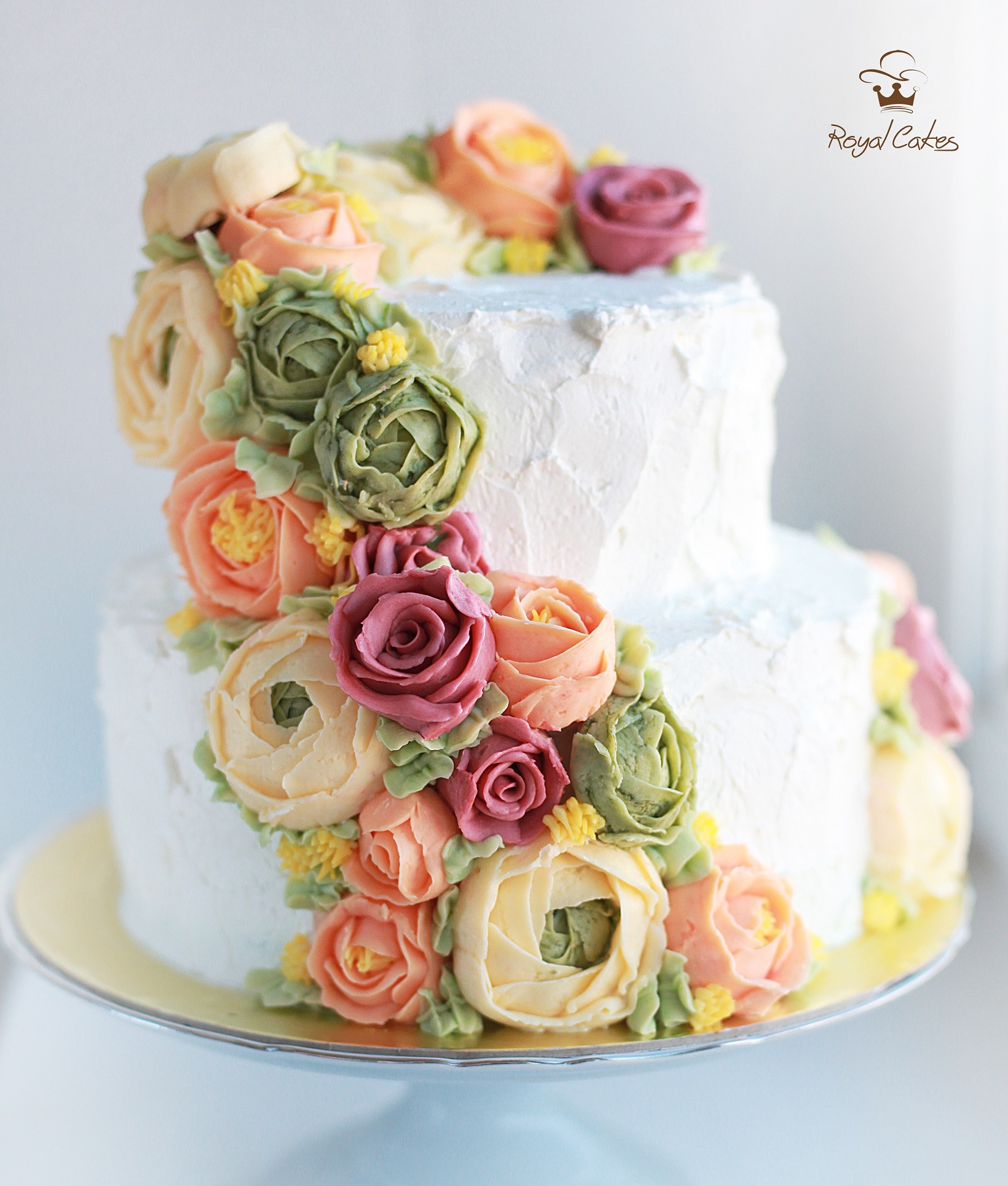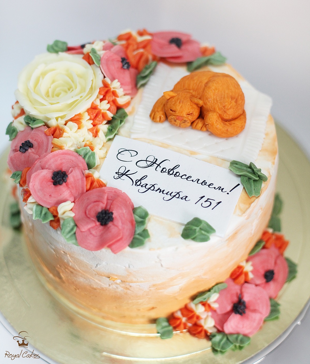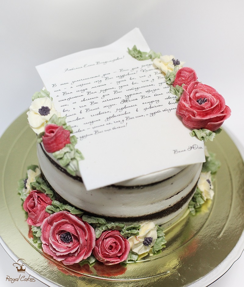 На данный момент моё любимое оформление торта и так сказать эксклюзивная работа — это масляные цветы. Ровный или голый торт, украшен полумесяцем цветами из крема. Так же в моде остается акварельные и амбре торты.